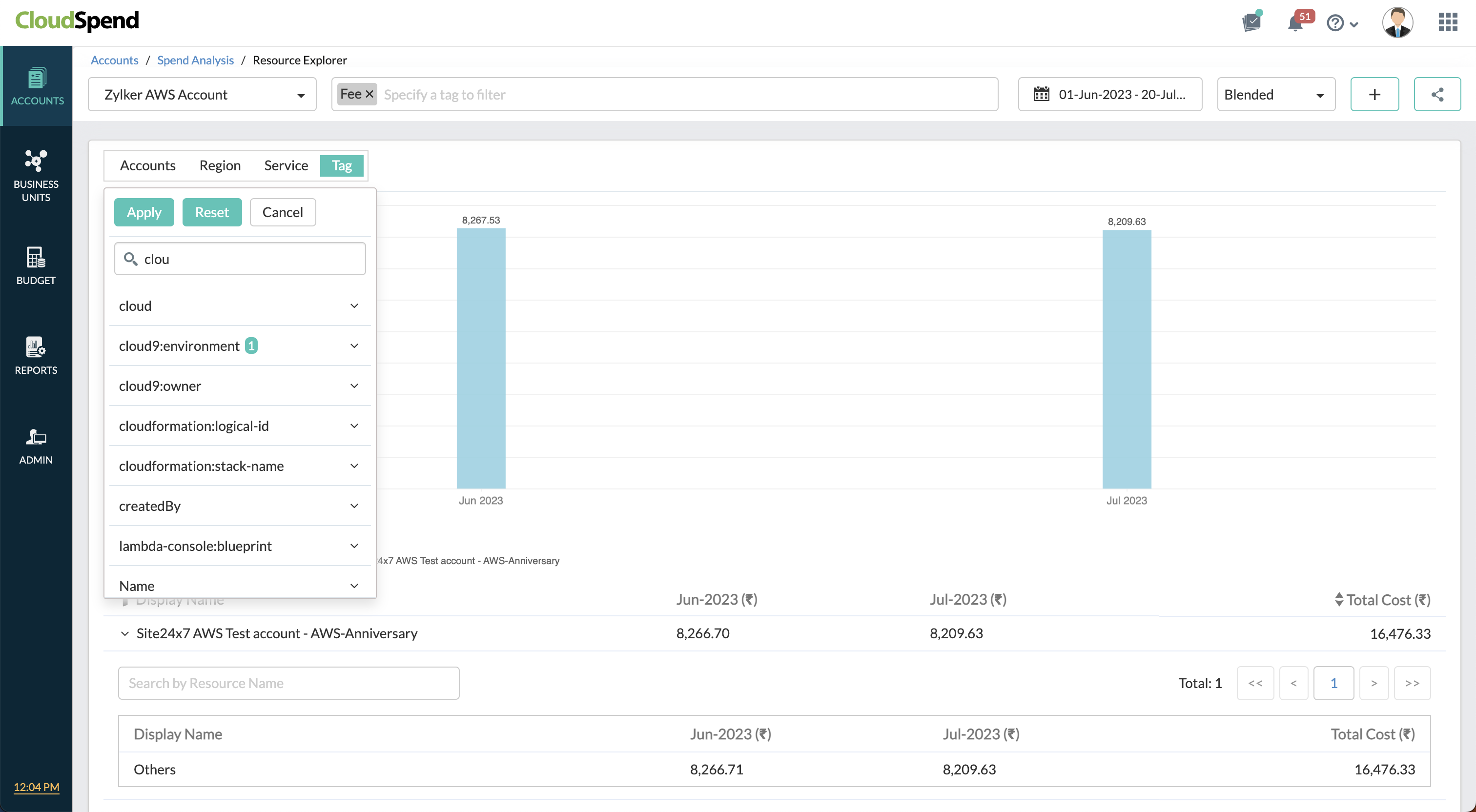 Tags at the Resource Explorer level of a BU enable you to view the spending pattern of resources. Built-in tags are displayed across the Resource Explorer section of a BU to help you obtain a drilled-down view of the cost accrued for each cloud resource.