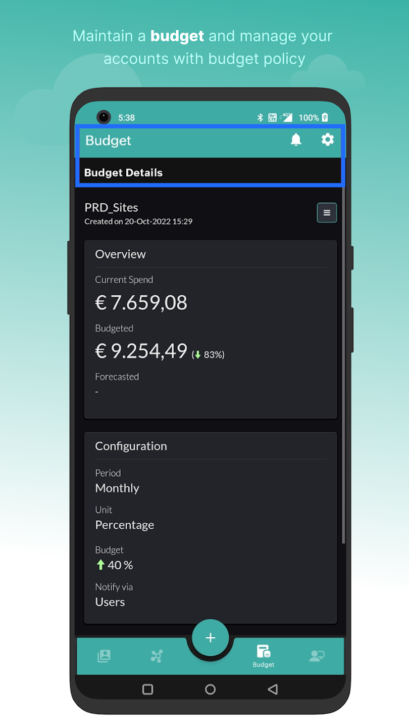 Tap the bell icon in the top-right corner of the screen to view your CloudSpend budget notifications. Tap any budget breach push notification to view your Budget Details screen.