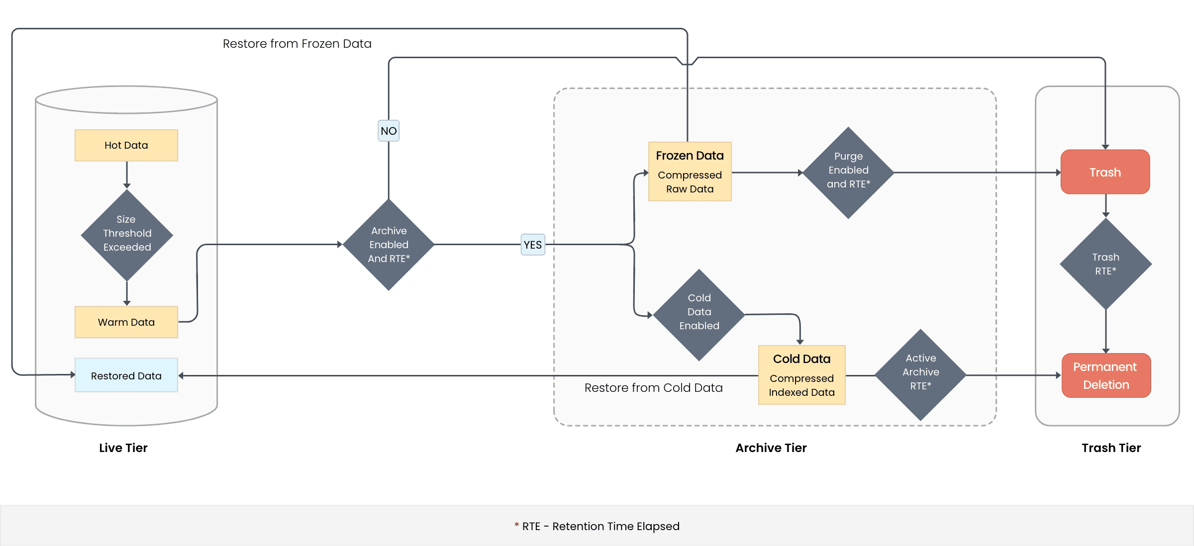 | Archivebene | Cold-Daten | Komprimierte, indizierte Auditing-Daten, auf die Sie seltener zugreifen würden. | Nicht durchsuchbar | Belegt 50 % weniger Speicherplatz als Hot-Daten (im Durchschnitt 300 MB) |