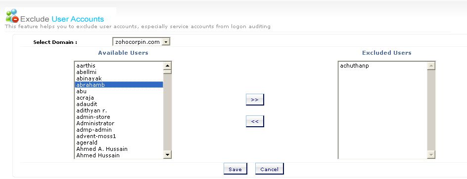 Diese Funktion hilft Ihnen, Benutzerkonten, insbesondere Dienstkonten, von der Anmeldeüberwachung auszuschließen. Diese Konten beanspruchen eine große Menge Speicherplatz in der Datenbank und Warnungen von diesen Konten erweisen sich als Zeitverschwendung für Administratoren.