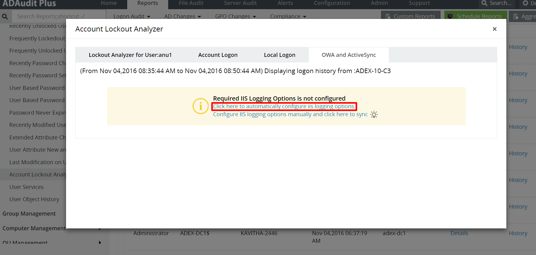 ADAudit Plus kann diese Konfigurationen automatisch einrichten. Führen Sie den Account Lockout Analyzer Bericht aus. Wenn ein Konto vorhanden ist, dessen Caller-Maschinenname auf einen Exchange-Server zeigt, klicken Sie darauf. Es erscheint ein Pop-up, das die Registerkarten OWA und ActiveSync enthält. In dieser Registerkarte finden Sie den Link Hier klicken, um die IIS-Protokolloptionen automatisch zu konfigurieren.