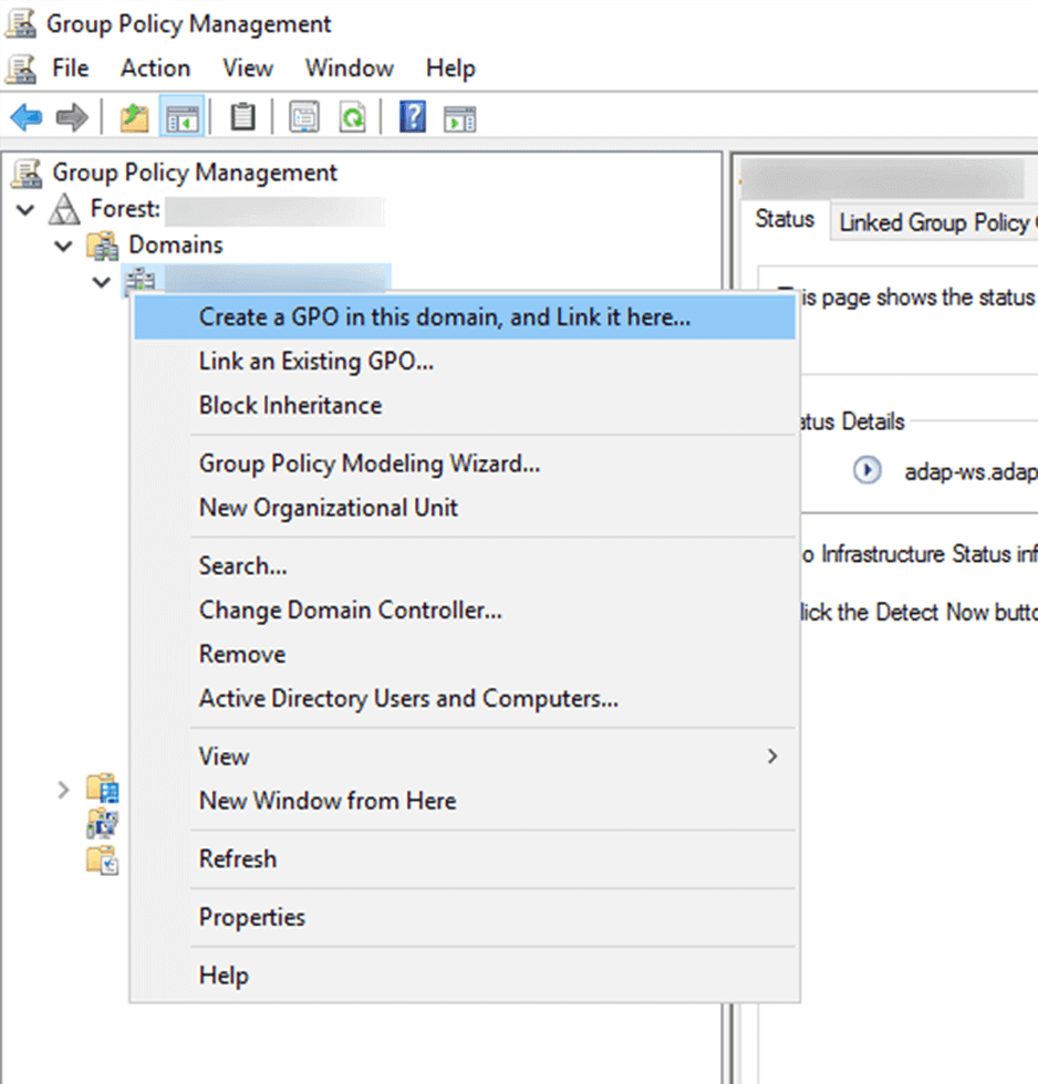 - Klicken Sie mit der rechten Maustaste auf die Domäne oder Organisationseinheit (OU), die Sie prüfen möchten, und klicken Sie auf GPO in dieser Domäne erstellen und Hier verknüpfen. Wenn Sie bereits ein Gruppenrichtlinienobjekt (GPO) erstellt haben, fahren Sie mit Schritt 4 fort.