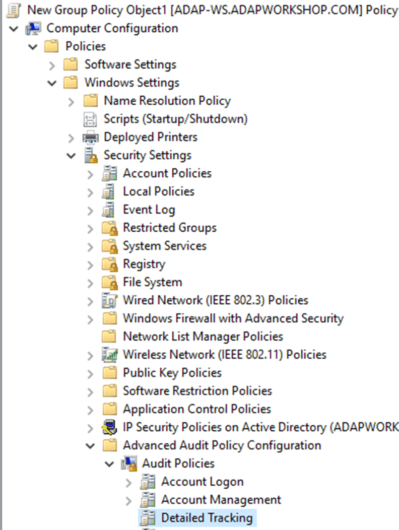 - Navigieren Sie im Gruppenrichtlinienverwaltungs-Editor im linken Fensterbereich zu Computerkonfiguration → Richtlinien → Windows-Einstellungen → Sicherheitseinstellungen → Erweiterte Überwachungsrichtlinienkonfiguration → Überwachungsrichtlinien → Detaillierte Nachverfolgung.