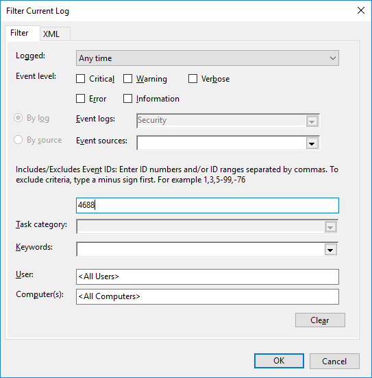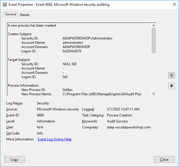 Ereignis 4688 wird protokolliert, wenn ein Prozess erstellt wird. Die folgenden Details werden in den Ereigniseigenschaften protokolliert: