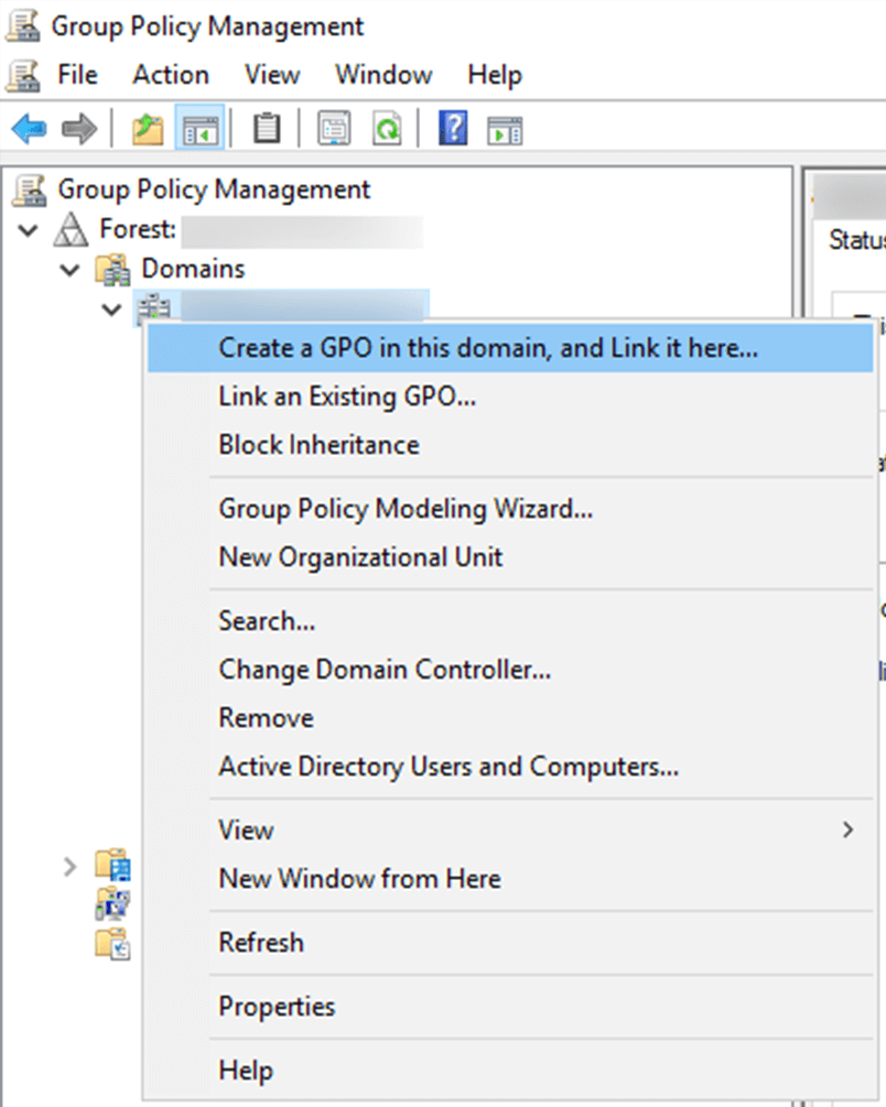 - Klicken Sie mit der rechten Maustaste auf die Domäne oder Organisationseinheit (OU), in der Sie Kontosperrungen überwachen möchten, und klicken Sie auf Gruppenrichtlinienobjekt (GPO) in dieser Domäne erstellen und Hier verknüpfen.