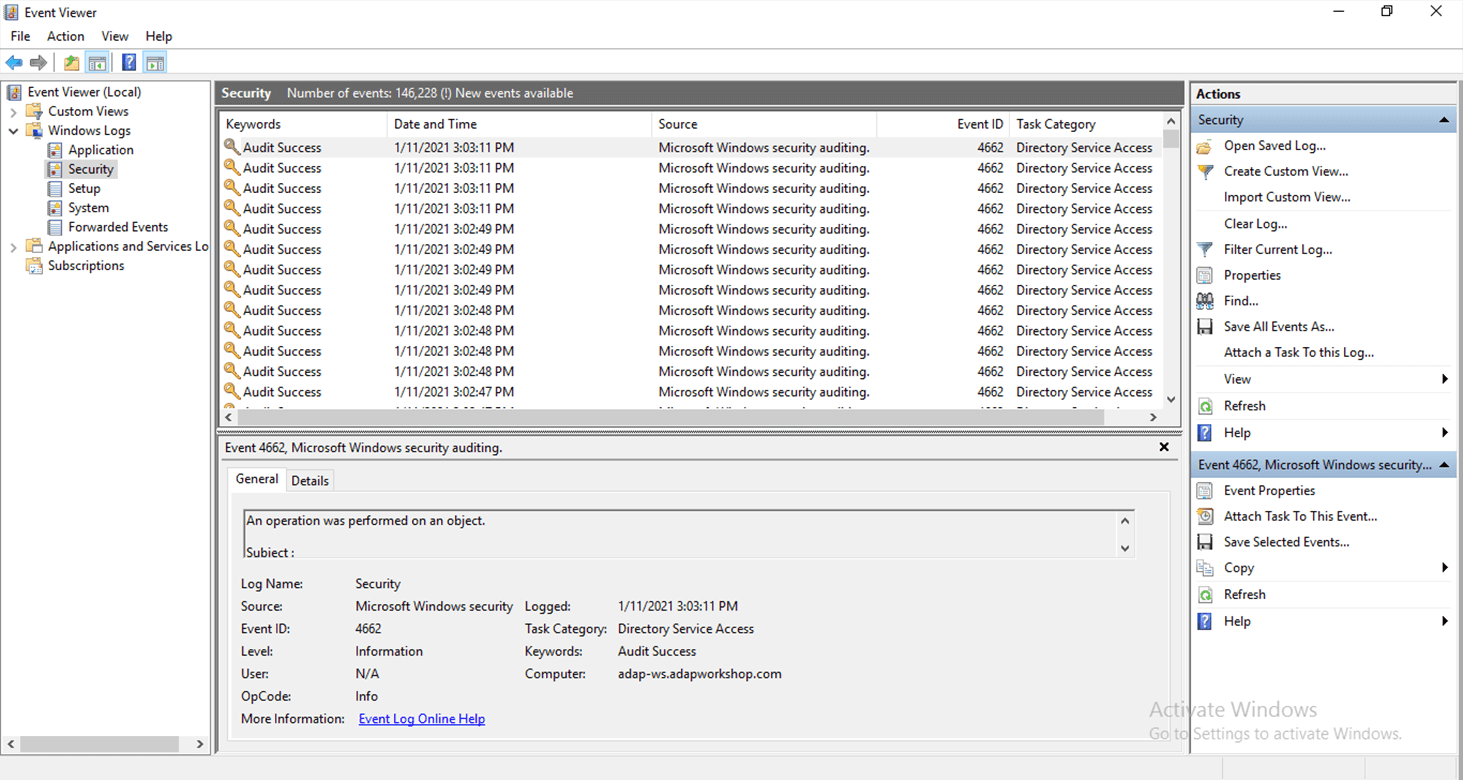 Sobald die oben genannten Schritte abgeschlossen sind, werden Ereignisse im Ereignisprotokoll protokolliert. Diese können in der Ereignisanzeige angezeigt werden, indem Sie die folgenden Schritte ausführen: