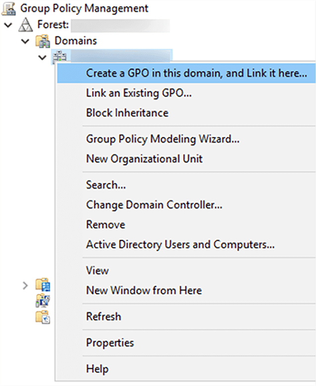 - Klicken Sie mit der rechten Maustaste auf die Domäne oder Organisationseinheit (OU), die Sie prüfen möchten, und klicken Sie auf GPO in dieser Domäne erstellen und Hier verknüpfen.... Wenn Sie bereits ein Gruppenrichtlinienobjekt (GPO) erstellt haben, fahren Sie mit Schritt 4 fort.