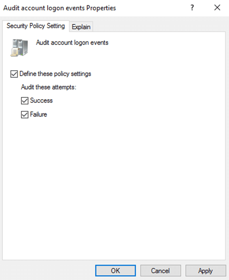 - Doppelklicken Sie im rechten Fensterbereich auf Überwachungsereignisse für die Kontoanmeldung, und aktivieren Sie die Kontrollkästchen neben Diese Richtlinieneinstellungen definieren, Erfolg und Fehler.