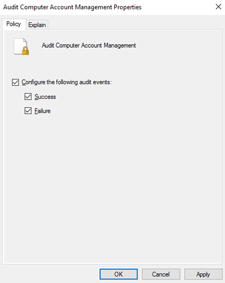 - Navigieren Sie zu Computerkonfiguration → Richtlinien → Windows-Einstellungen → Sicherheitseinstellungen → Erweiterte Überwachungsrichtlinienkonfiguration → Überwachungsrichtlinien → Kontoverwaltung → Überwachung der Computerkontenverwaltung, und aktivieren Sie die Kontrollkästchen neben Konfigurieren der folgenden Überwachungsereignisse, Erfolg und Fehler.