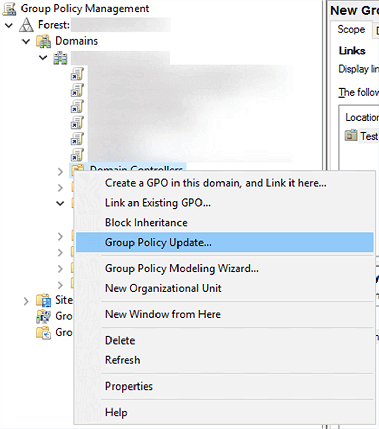 - Kehren Sie zur Gruppenrichtlinien-Verwaltungskonsole zurück, klicken Sie im linken Fensterbereich mit der rechten Maustaste auf die gewünschte OU, mit der das Gruppenrichtlinienobjekt verknüpft wurde, und klicken Sie auf Gruppenrichtlinienaktualisierung... Durch diesen Schritt wird sichergestellt, dass die neuen Gruppenrichtlinieneinstellungen sofort angewendet werden, anstatt auf die nächste geplante Aktualisierung zu warten.
