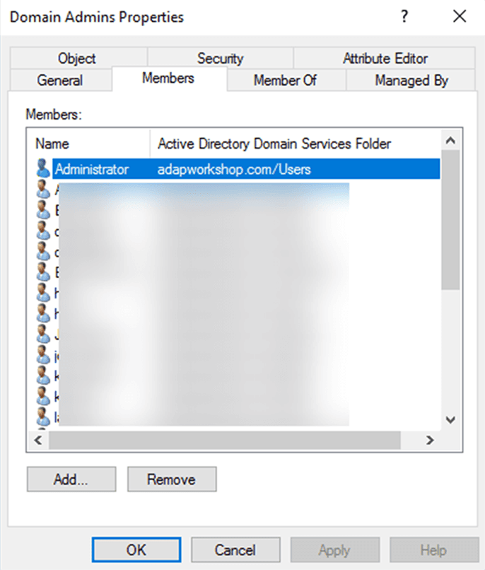 Sobald die oben genannten Schritte abgeschlossen sind, werden die Ereignisse im Ereignisprotokoll gespeichert. Diese können in der Ereignisanzeige angezeigt werden. Zuvor müssen Sie jedoch herausfinden, welche Benutzer über Administratorrechte verfügen. Führen Sie die folgenden Aktionen auf einem Domänencontroller (DC) aus: