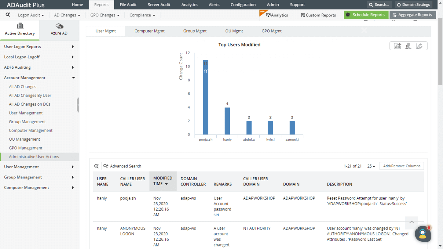 ADAudit Plus, ein umfassendes AD-Überwachungstool, hilft Ihnen bei der Überwachung aller Änderungen an Ihrem Active Directory, einschließlich der von Administratorkonten durchgeführten Änderungen.