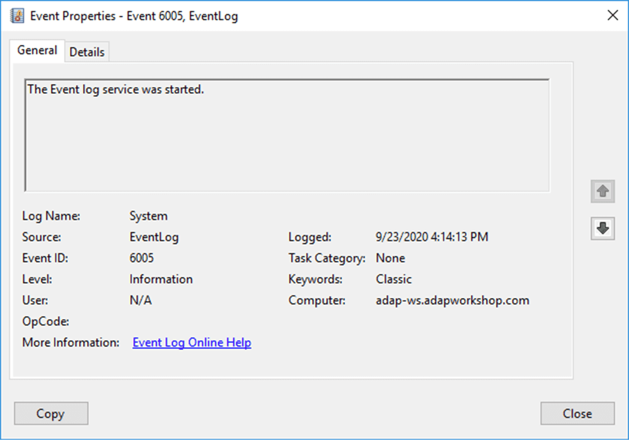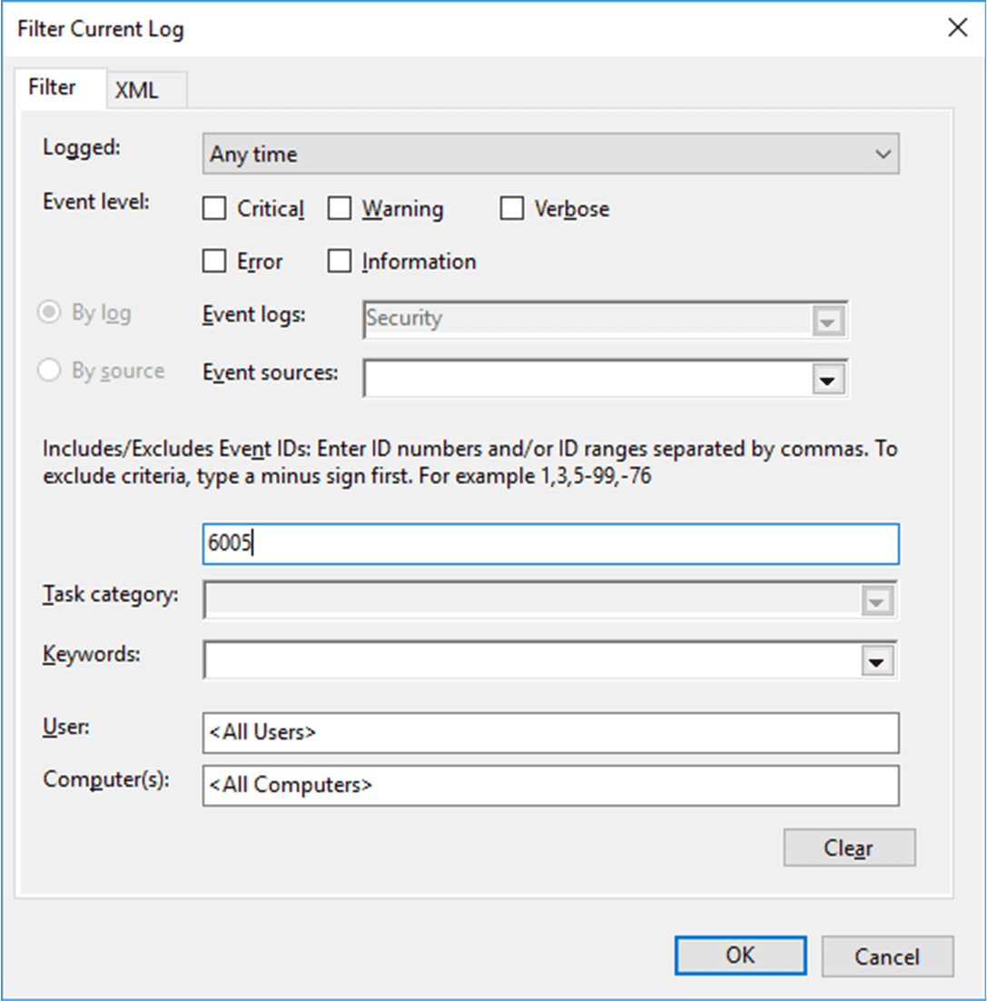 | 6005 | Der Ereignisprotokolldienst wurde gestartet (Computer wurde gestartet) |