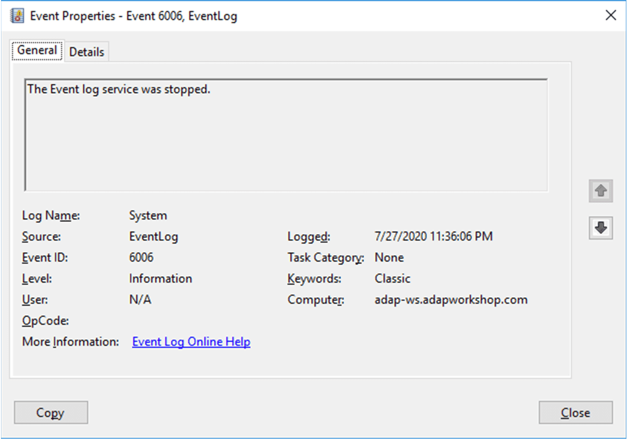 | 6006 | Der Ereignisprotokolldienst wurde beendet (Computer wurde heruntergefahren) |