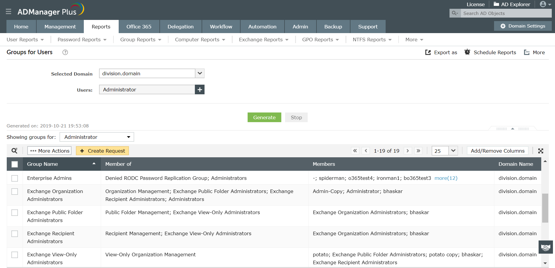 Neben Berichten zur Gruppenmitgliedschaft bietet ADManager Plus auch viele weitere gruppenspezifische Berichte wie den Sicherheitsgruppenbericht, den Bericht zu Gruppen ohne Manager sowie Berichte zu Gruppentyp und Geltungsbereich. Außerdem gibt es zahlreiche Berichte zu AD, Exchange Server und Office 365 einschließlich zugehöriger Management-Funktionen. Laden Sie jetzt ADManager Plus herunter und probieren Sie alle Funktionen selbst aus, z. B. die Berichte zur AD-Benutzergruppenmitgliedschaft!