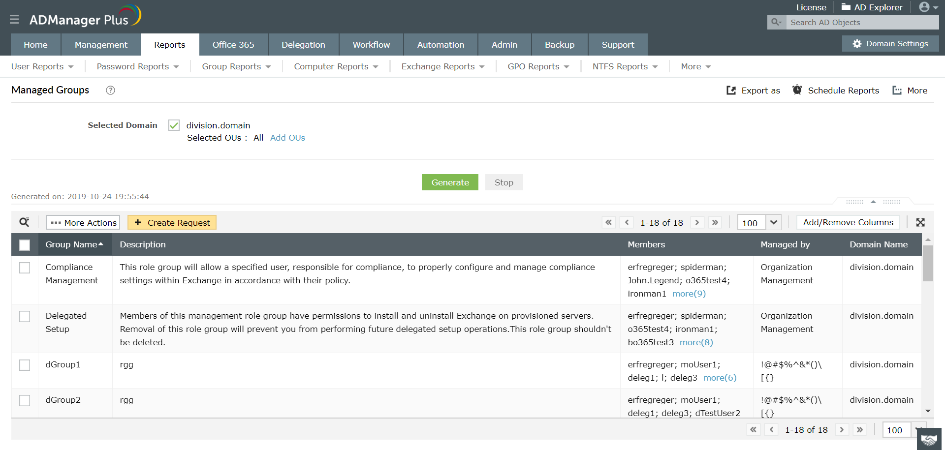- Bericht über verwaltete/nicht verwaltete Gruppen: Mit diesem Bericht können Sie alle verwalteten und nicht verwalteten Exchange- und Active Directory-Gruppen in Ihrer Organisation auffinden.