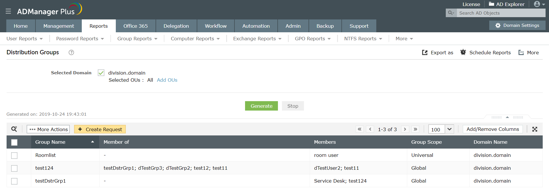 - Bericht über Gruppentypen und -umfänge: Sie können alle Verteilerlisten in Ihrer Organisation auf der Grundlage ihrer Geltungsbereiche wie Global, Domänenspezifisch und Universal abrufen.