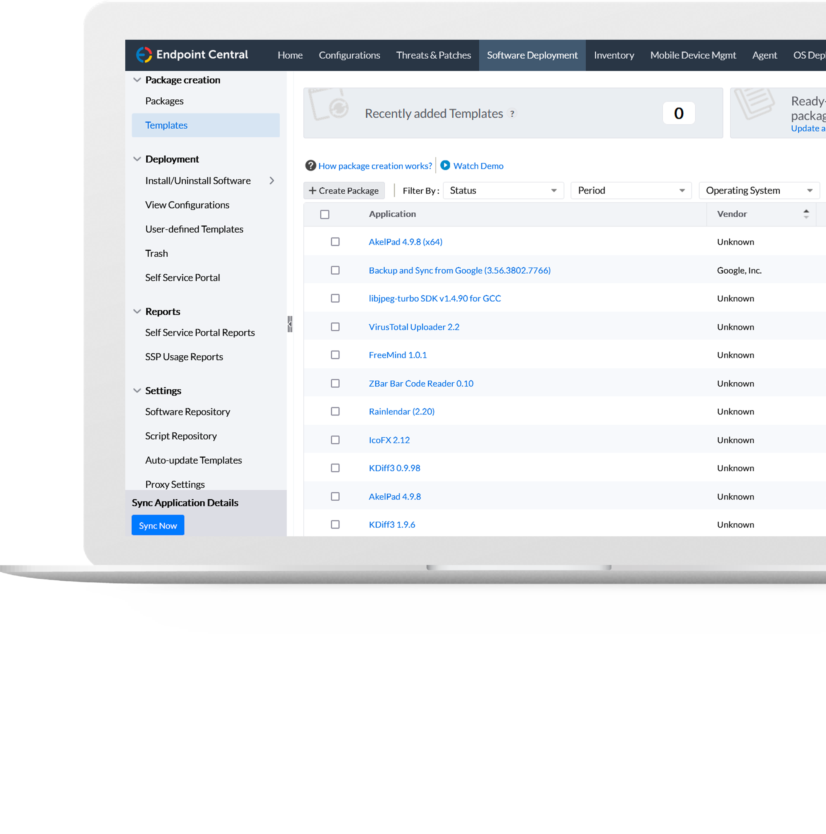 Mit Endpoint Central können Sie Softwarepakete von einer zentralen Konsole aus ohne Benutzereingriff an alle Computer in Ihrem Netzwerk unter Windows, Mac und Linux verteilen.