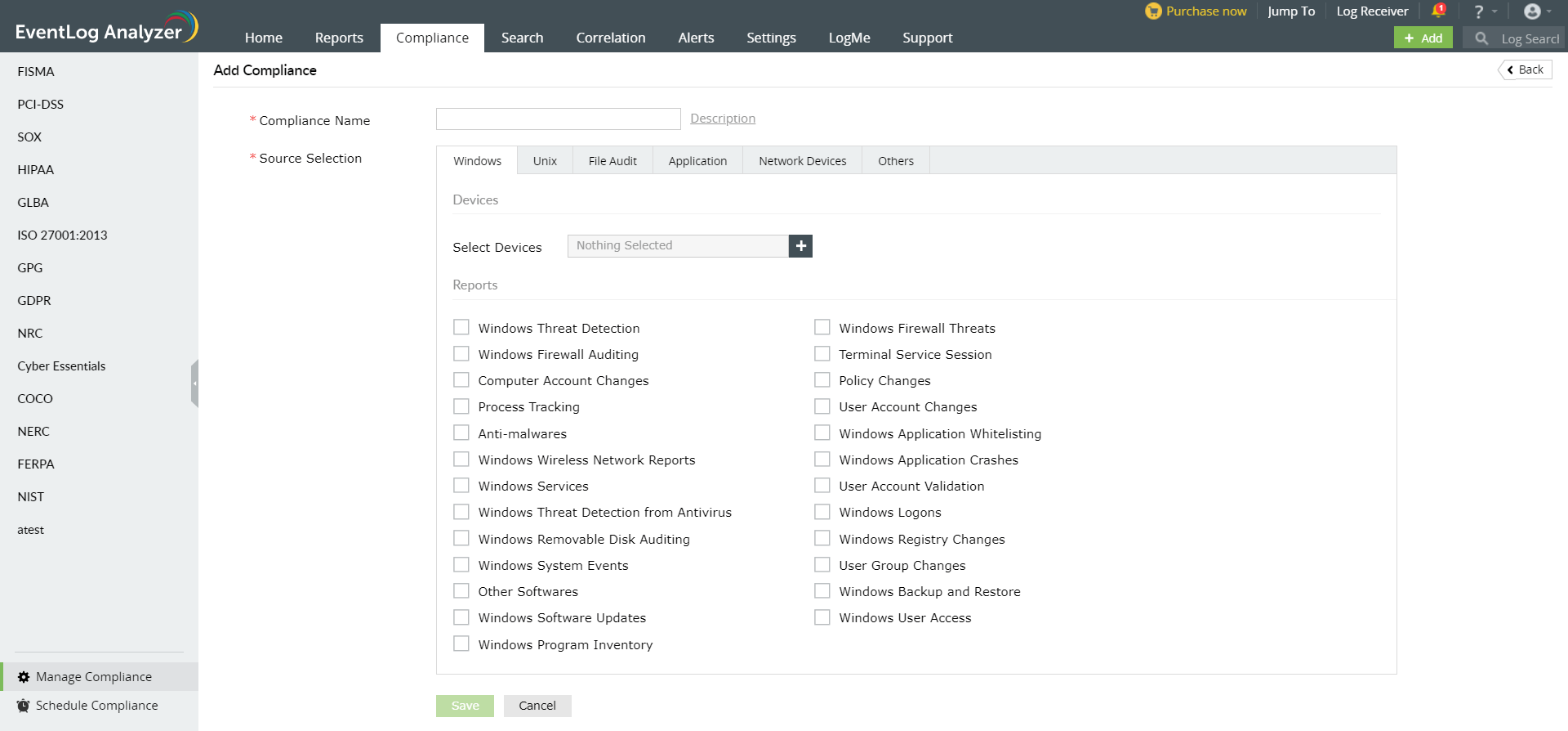 EventLog Analyzer bietet Ihnen sofort einsatzbereite Compliance-Berichte, die Ihnen helfen, die verschiedenen gesetzlichen Vorschriften zu erfüllen. Die Software bietet Ihnen auch die Möglichkeit, einen neuen Bericht zu erstellen und zu planen, der Ihnen hilft, die Anforderungen neuer Compliance-Mandate oder interner Sicherheitsrichtlinien zu erfüllen.