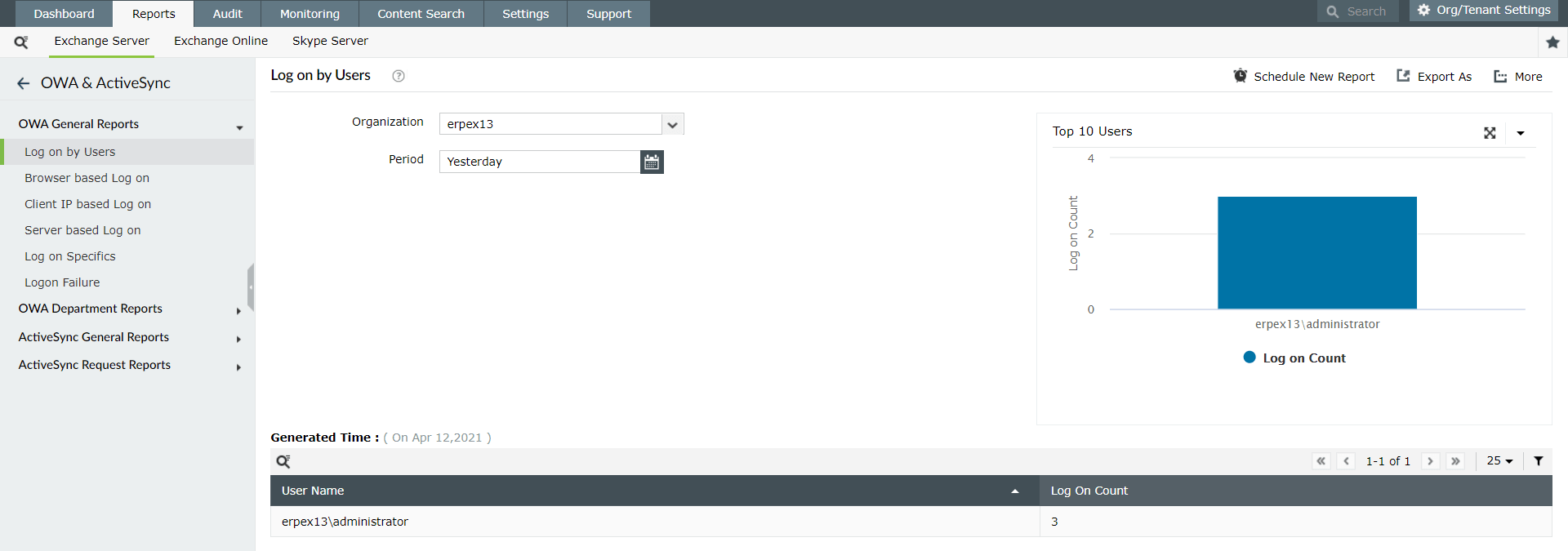 Der Exchange-Bericht zu E-Mail-Anmeldungen über OWA bietet Details darüber, wie häufig die Nutzer per OWA auf ihre E-Mails zugegriffen haben (sowohl von Vor-Ort-Servern und in Exchange Online). Dieser Bericht hilft Ihnen bei der Überwachung alle Nutzeraktivitäten in Outlook im Web, und der Nutzungsdichte pro Nutzer.