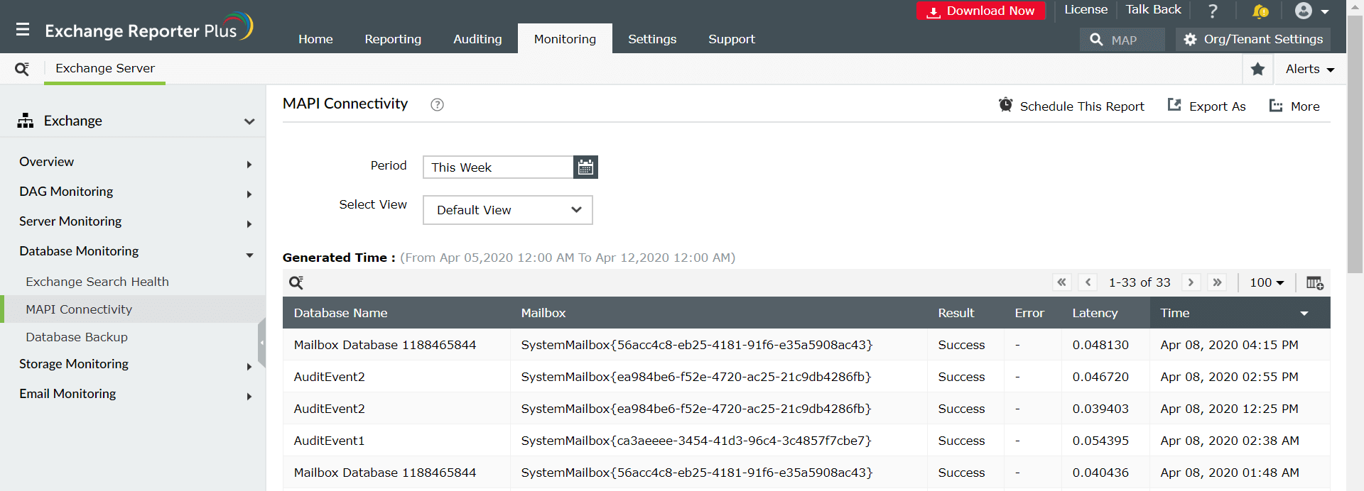 Exchange Reporter Plus, ist ein Tool für Berichte, Änderungs-Auditing und Überwachung, das viel mehr leistet, als einfach nur die Konnektivität eines Exchange-Servers zu testen. Das Überwachungstool präsentiert Ihnen feinkörnige Details, wie die Zeit des Verbindungsversuchs, eventuell aufgetretene Fehler, Latenzen und mehr.