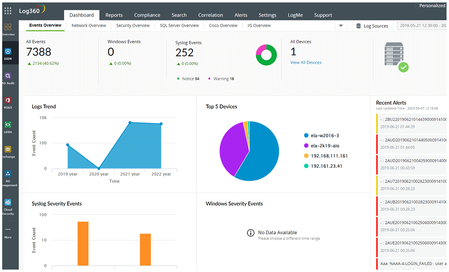 Eine SIEM-Lösung bietet Echtzeitanalysen und Warnmeldungen für Sicherheitsereignisse. Dies wird durch anpassbare Dashboards erreicht, die Diagramme, Grafiken und Berichte auf benutzerfreundliche Weise anzeigen. So können Sie Cyberangriffe abwehren, indem Sie Netzwerkereignisse besser verstehen und bei verdächtigen Aktivitäten alarmiert werden.
