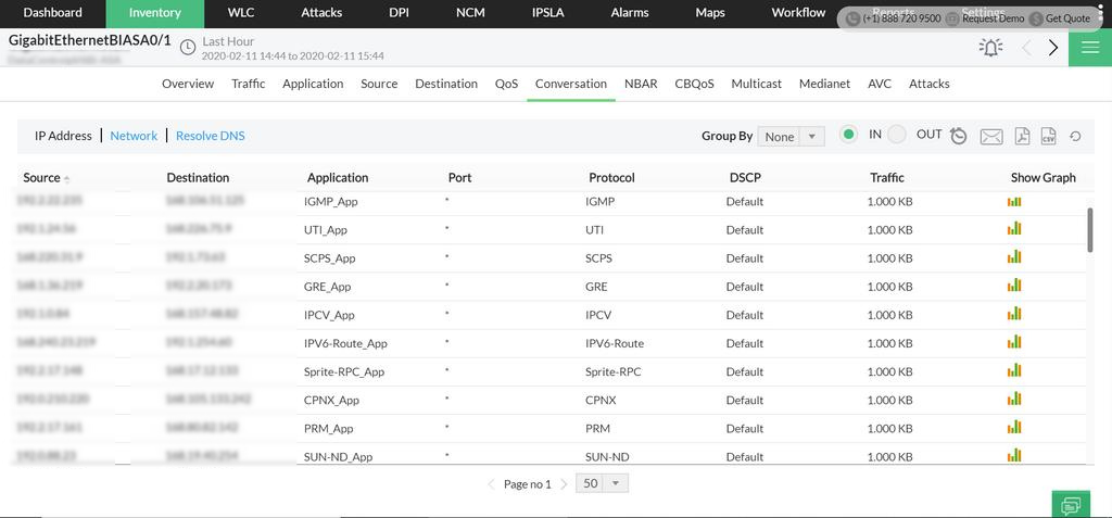 Mit NetFlow Analyzer können Sie Details zum Datenverkehr mit Metriken wie Quell-IP-Adresse, Ziel-IP-Adresse in Bezug auf den Standort sowie den wichtigsten Konversationen und Protokollen anzeigen. Mit der Datenflussanalyse können Sie Details zum Datenverkehr für alle ermittelten Schnittstellen in Bezug auf Volumen, Geschwindigkeit und Auslastung anzeigen, um die Qualität des Netzwerks festzustellen.