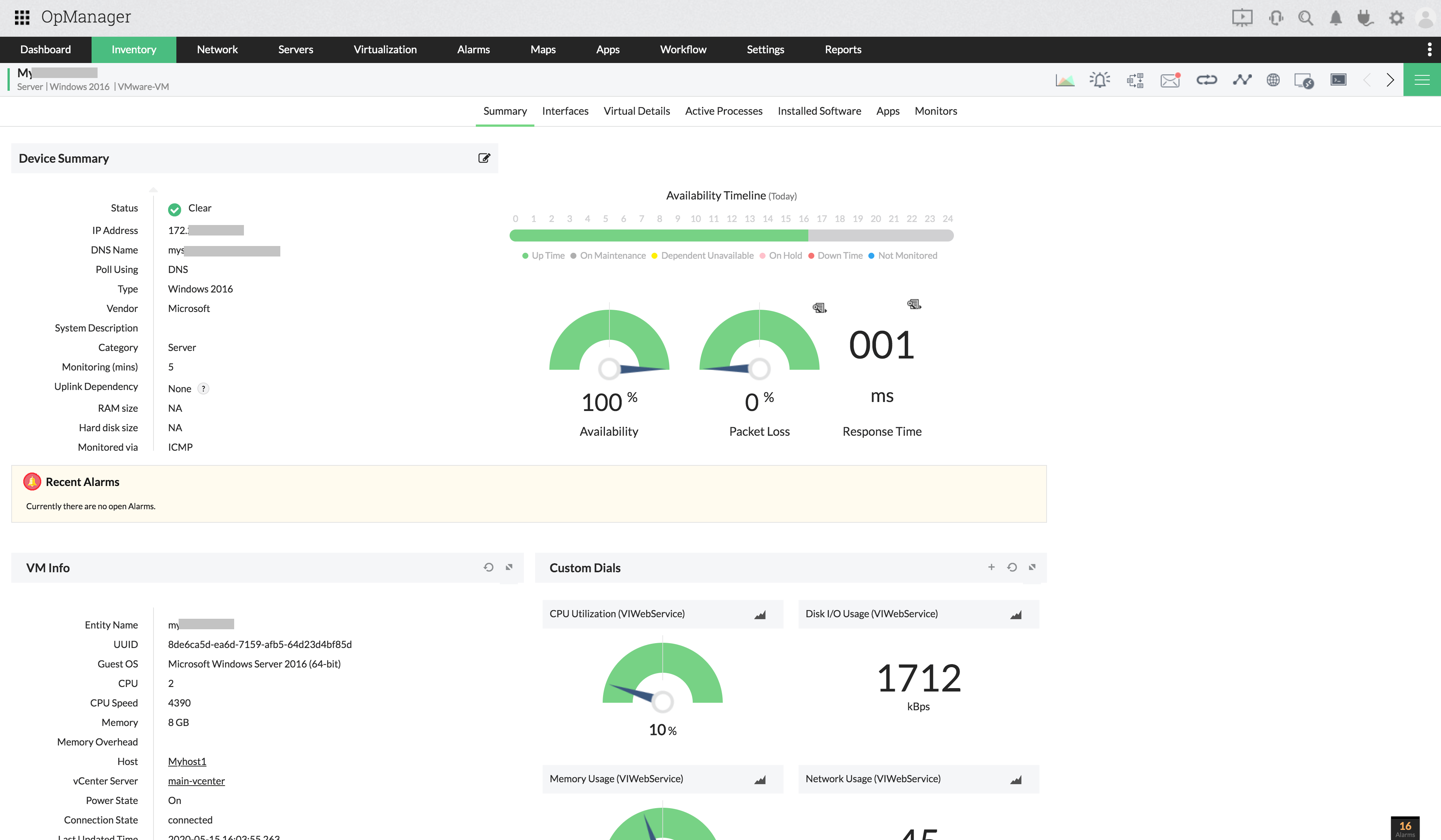 Nachdem OpManager die Netzwerkressourcen Ihres Rechenzentrums erkannt hat, wird basierend auf dem Gerätetyp automatisch ein Leistungsmonitoring festgelegt. Sowohl physische als auch virtuelle Server können überwacht werden und mithilfe von SNMP-/WMI-/CLI-Protokollen werden Leistungsdaten aus den Geräten abgerufen.