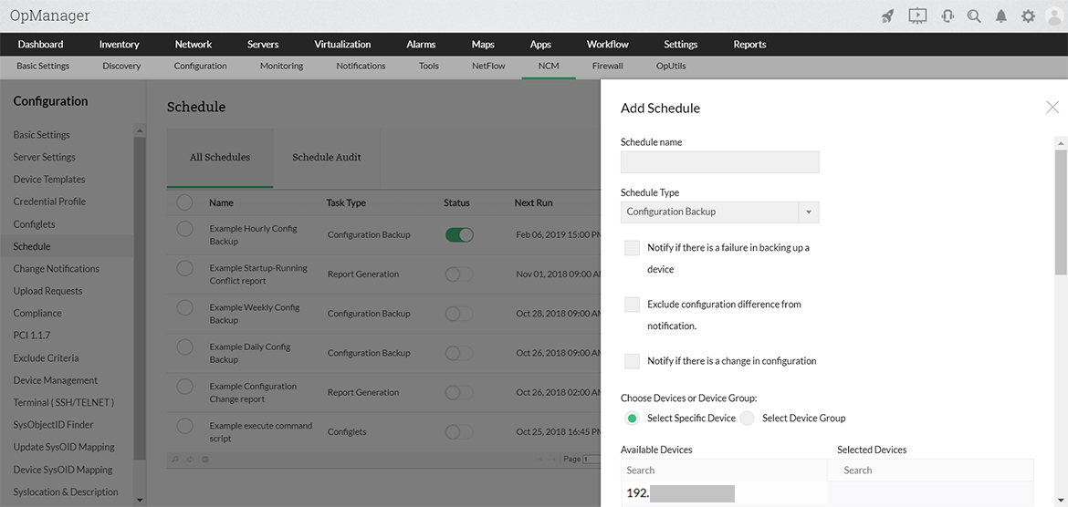 Im Modul für das Netzwerkkonfigurations-Management von OpManager können Sie sämtliche Konfigurationsänderungen verwalten. OpManager ermöglicht es Ihnen, alle Konfigurationen zu sichern, Sicherungen automatisch ausführen zu lassen und diese hochzuladen, um Ausfallzeiten zu reduzieren. Mit dem Netzwerkmanagement-Tool von OpManager können Sie außerdem Änderungen im Blick behalten, sehen, wer welche Änderung vorgenommen hat, was geändert wurde und wann die Änderung erfolgt ist. OpManager sendet Änderungsbenachrichtigungen per E-Mail, SNMP-Trap und Syslog-Meldung.