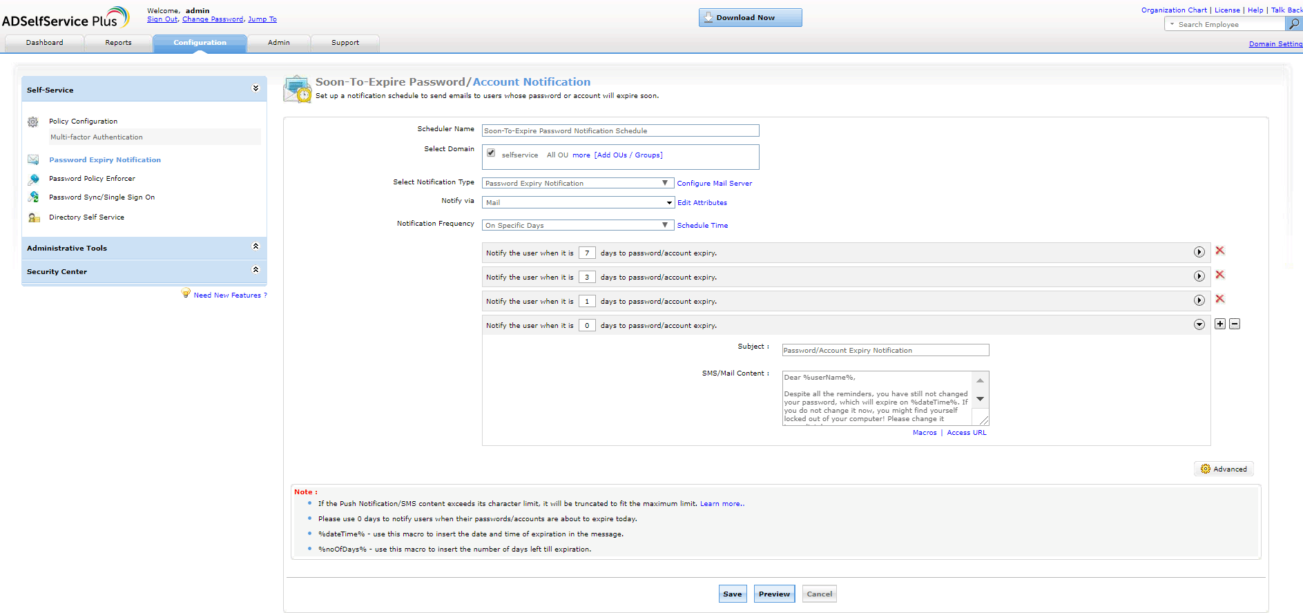 Da es ein wenig unwahrscheinlich ist, dass Benutzer sofort auf eine einmalige Passwortänderungserinnerung reagieren, gibt Ihnen die ADSelfService-Plus-Passwortablauferinnerung die Möglichkeit, Benachrichtigungen in unterschiedlichen Abständen auf den Weg zu schicken. Beispielsweise können Sie die erste E-Mail-Passwortablauferinnerung 15 Tage vor Passwortablauf versenden, die Zweite, wenn noch 10 Tage übrig sind, die Dritte bei 7 Tagen Differenz, die Vierte bei 3 Tagen – und die Fünfte und Letzte, wenn nur noch ein einziger Tag verbleibt. Sie können auch den Ton der E-Mail von Mal zu Mal dringlicher gestalten! (Dieses System, das mehrere Passwortablauferinnerungen in unterschiedlichen Dringlichkeitsgraden versendet, erweist sich gewöhnlich als deutlich erfolgreicher, wenn es darum geht, Benutzer zum Ändern ihres Passwortes zu bewegen, bevor es zu spät ist.)