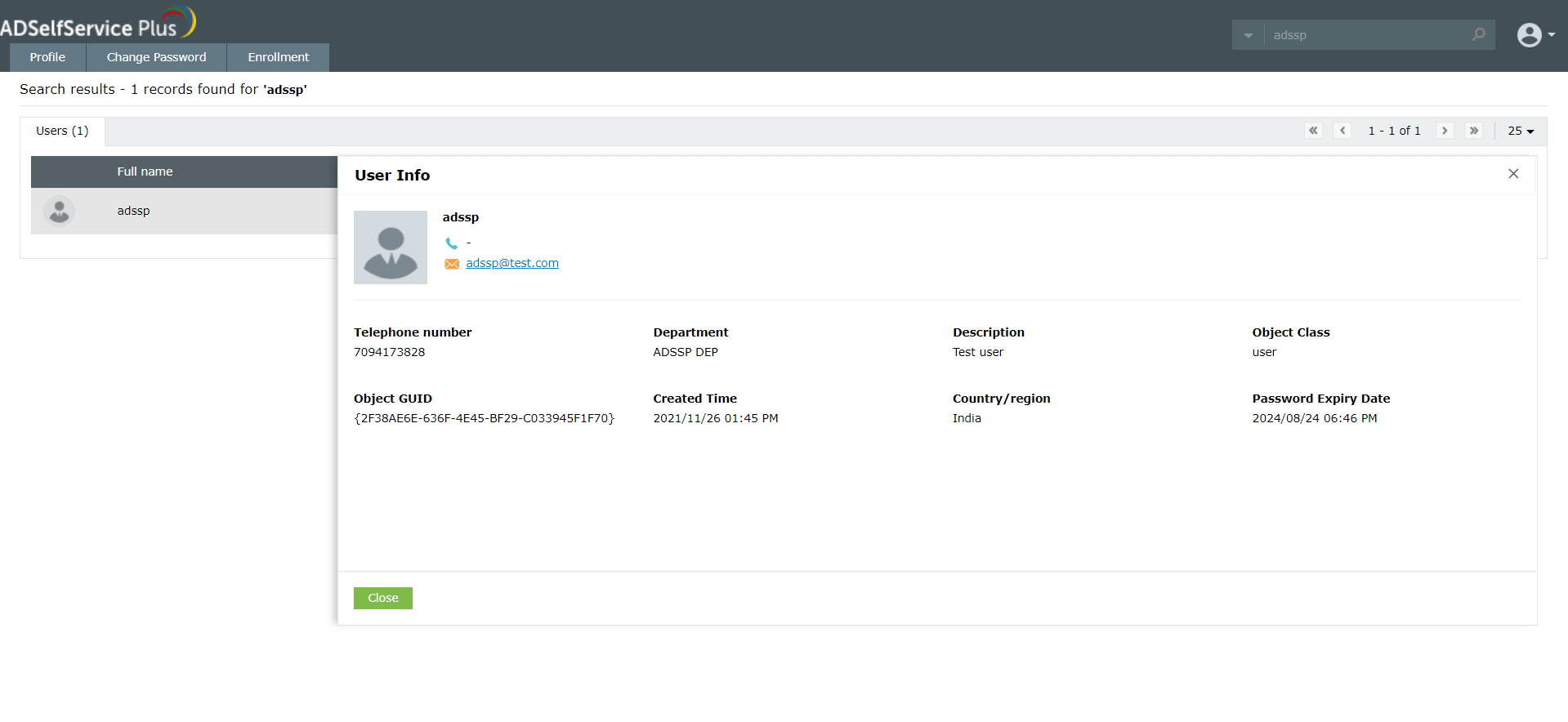 ADSelfService Plus ist eine Self-Service-Passwortverwaltungs-, MFA- und SSO-Lösung, die eine intelligente Unternehmensverzeichnissuche bietet, die in der Branche üblicherweise als Mitarbeitersuche oder People Finder bekannt ist. Dieses AD-Suchtool bietet Ihnen sogar mehrere gängige Suchfilter, z.B. Mitarbeitersuche nach E-Mail-Adresse. Vier verschiedene Suchoptionen - enthält, beginnt mit, endet mit und entspricht - machen die Mitarbeitersuche so einfach wie möglich! Endbenutzer können diese Unternehmensverzeichnissuche über das Mitarbeiter-Self-Service-Portal (oben rechts) aufrufen.
