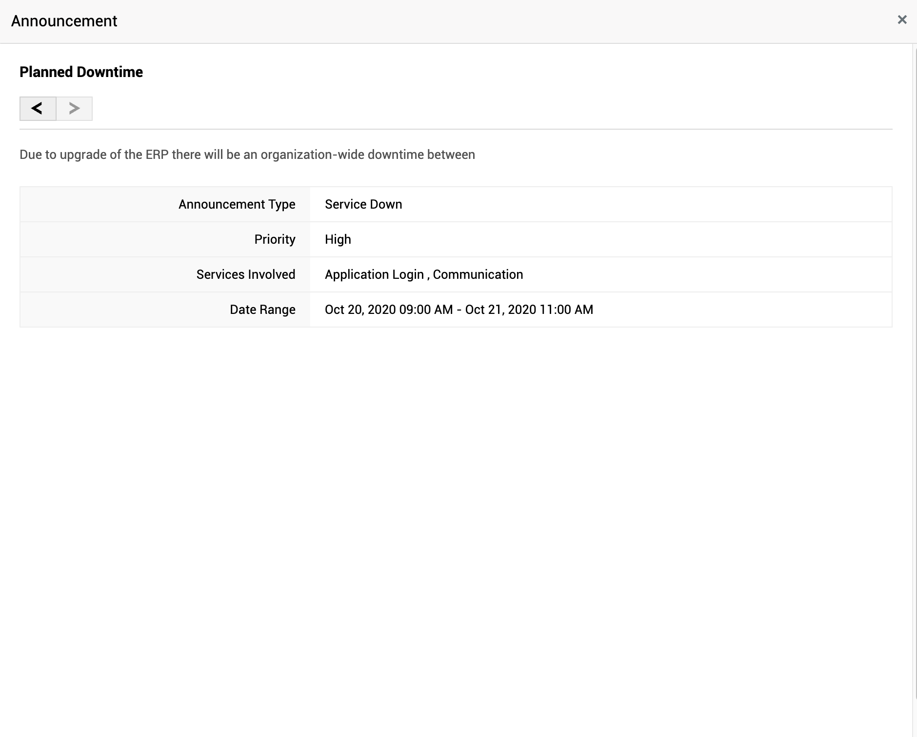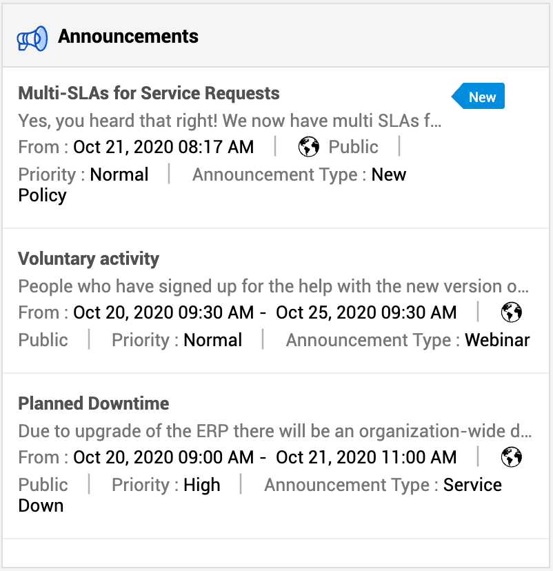 Auf der Startseite zeigt das Widget „Ankündigungen“ alle unternehmensweiten Informationen an. Dies können Informationen über eine geplante Ausfallzeit oder andere wichtige Aktualisierungen vom Service Desk sein.