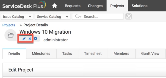 Um ein Projekt zu bearbeiten oder zu löschen, klicken Sie auf das Projekt und dann auf das Symbol zum Bearbeiten oder Löschen auf der Detailseite des Projekts.