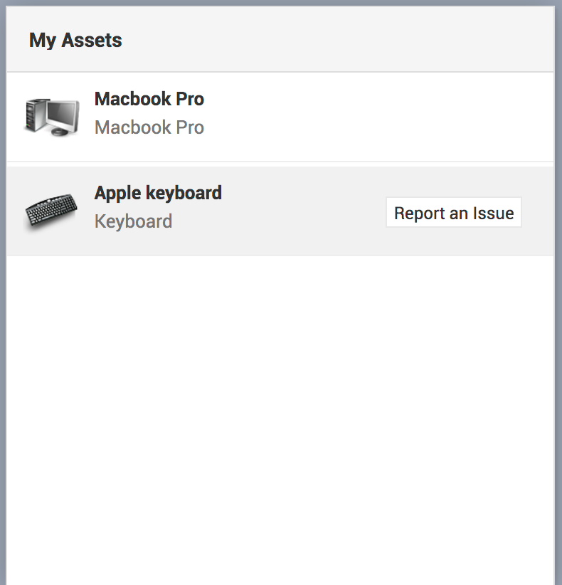 Um eine Anfrage zu einem der Assets in diesem Widget zu stellen, bewegen Sie den Mauszeiger über das Asset, klicken Sie auf Problem melden, und fahren Sie dann mit der Erfassung des Problems fort.