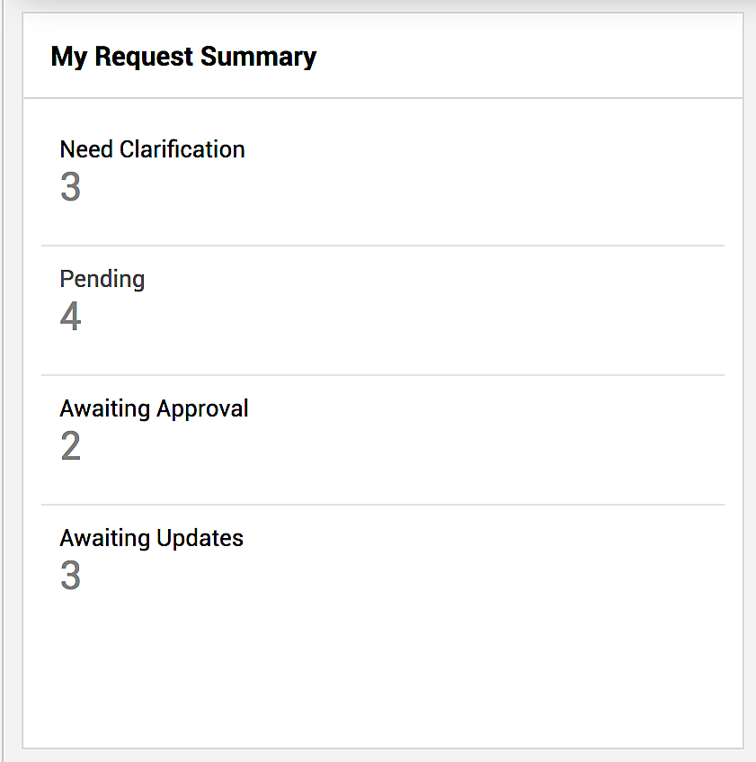 Das Widget „Meine Anfragenübersicht“ bietet einen Überblick über die von Ihnen erfassten Anfragen. Auf einen Blick sehen Sie die Anzahl der Anfragen, die einer Klärung bedürfen, ausstehend sind, auf Genehmigung warten und auf Aktualisierungen warten.