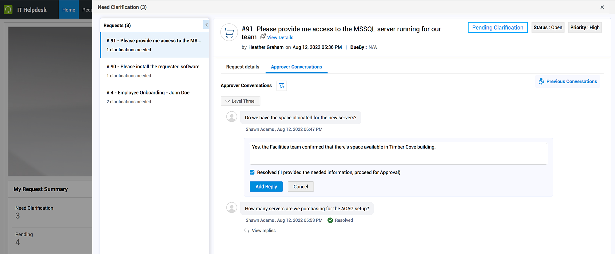 - Im Tab Genehmiger-Konversationen einer Anfrage werden die von den Genehmigern auf der aktuellen Genehmigungsstufe gestellten Fragen aufgelistet, wobei die neueste Frage oben steht. Bewegen Sie den Mauszeiger über eine Frage und klicken Sie auf Antworten.