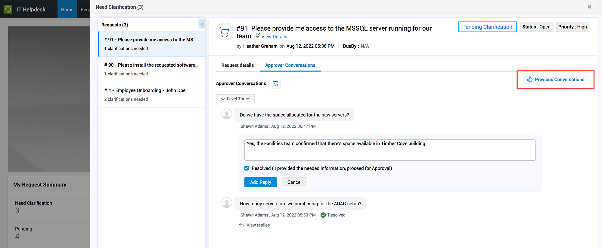 Verwenden Sie die Schaltfläche Vorherige Konversationen in der rechten Ecke des Tabs Genehmiger-Konversationen, um die Klärungsanfragen aus vorherigen Genehmigungsstufen anzuzeigen.