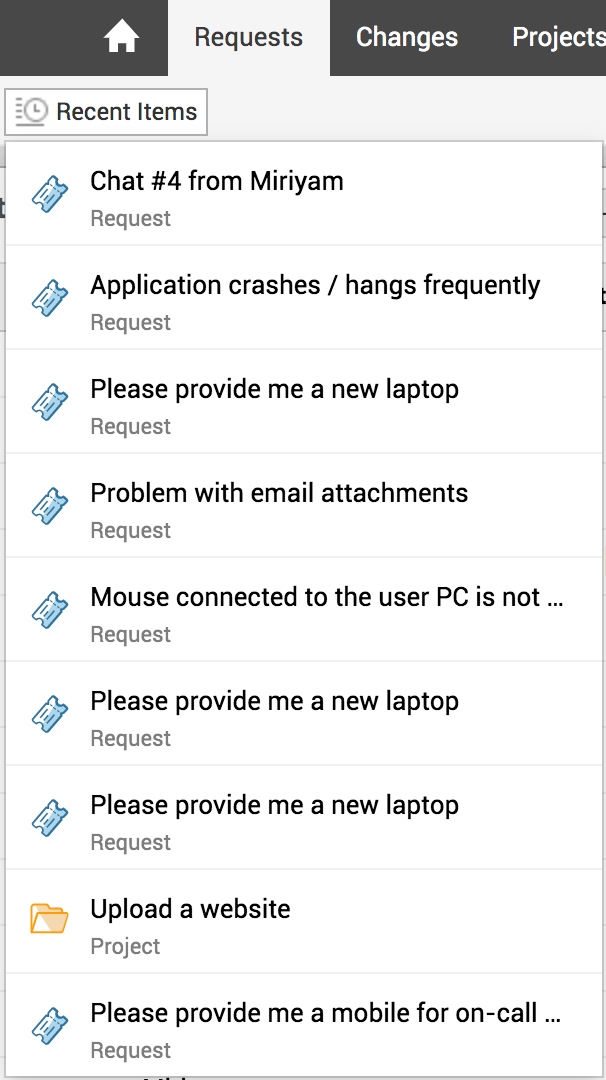 Die zuletzt aufgerufenen Elemente, Vorfälle und Serviceanfragen werden unter dieser Schaltfläche angezeigt: