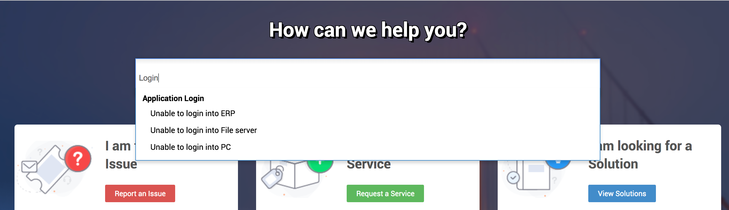 Das Such-Widget ermöglicht es Ihnen, nach bestimmten Service- und Incident-Vorlagen zu suchen und diese zu finden. Geben Sie Buchstaben oder Schlüsselwörter in das Suchfeld ein und wählen Sie aus der angezeigten Ergebnisliste aus.