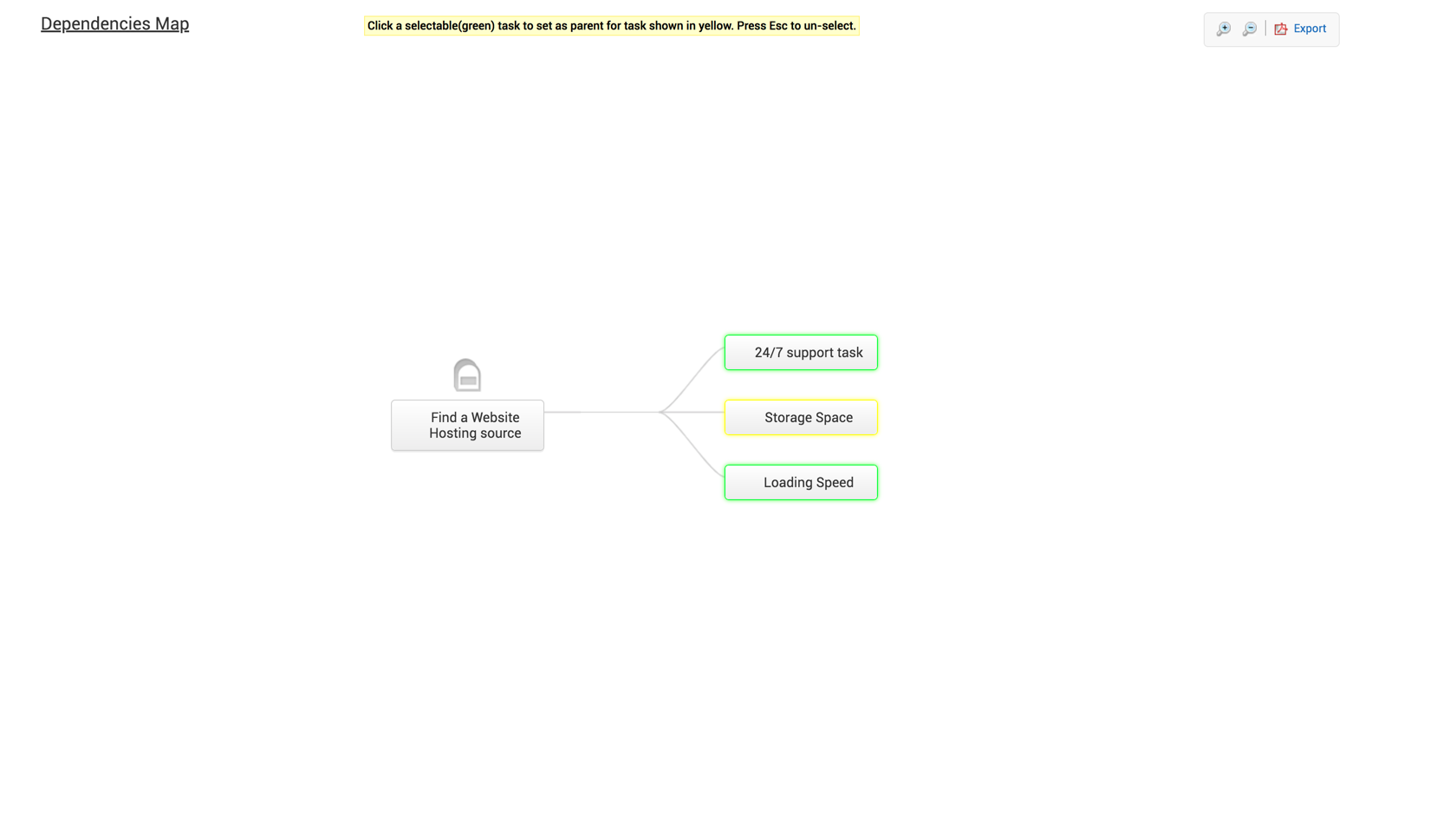 Wie im folgenden Screenshot gezeigt, bewegen Sie den Mauszeiger über eine Aufgabe, die dann gelb hervorgehoben wird, und wählen Sie anschließend ihre übergeordnete Aufgabe aus den grün hervorgehobenen Aufgaben aus.