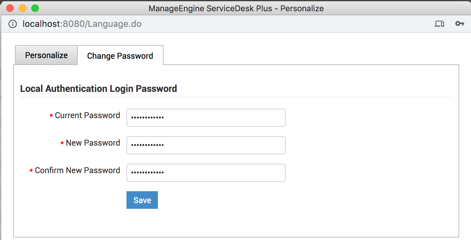 Dieser Abschnitt ist nur verfügbar, wenn die lokale Authentifizierung für ServiceDesk Plus aktiviert ist. Wenn die lokale Authentifizierung deaktiviert ist, werden Passwortänderungen nur für Zwecke der lokalen Authentifizierung wirksam und nicht im Active Directory oder in SAML aktualisiert.