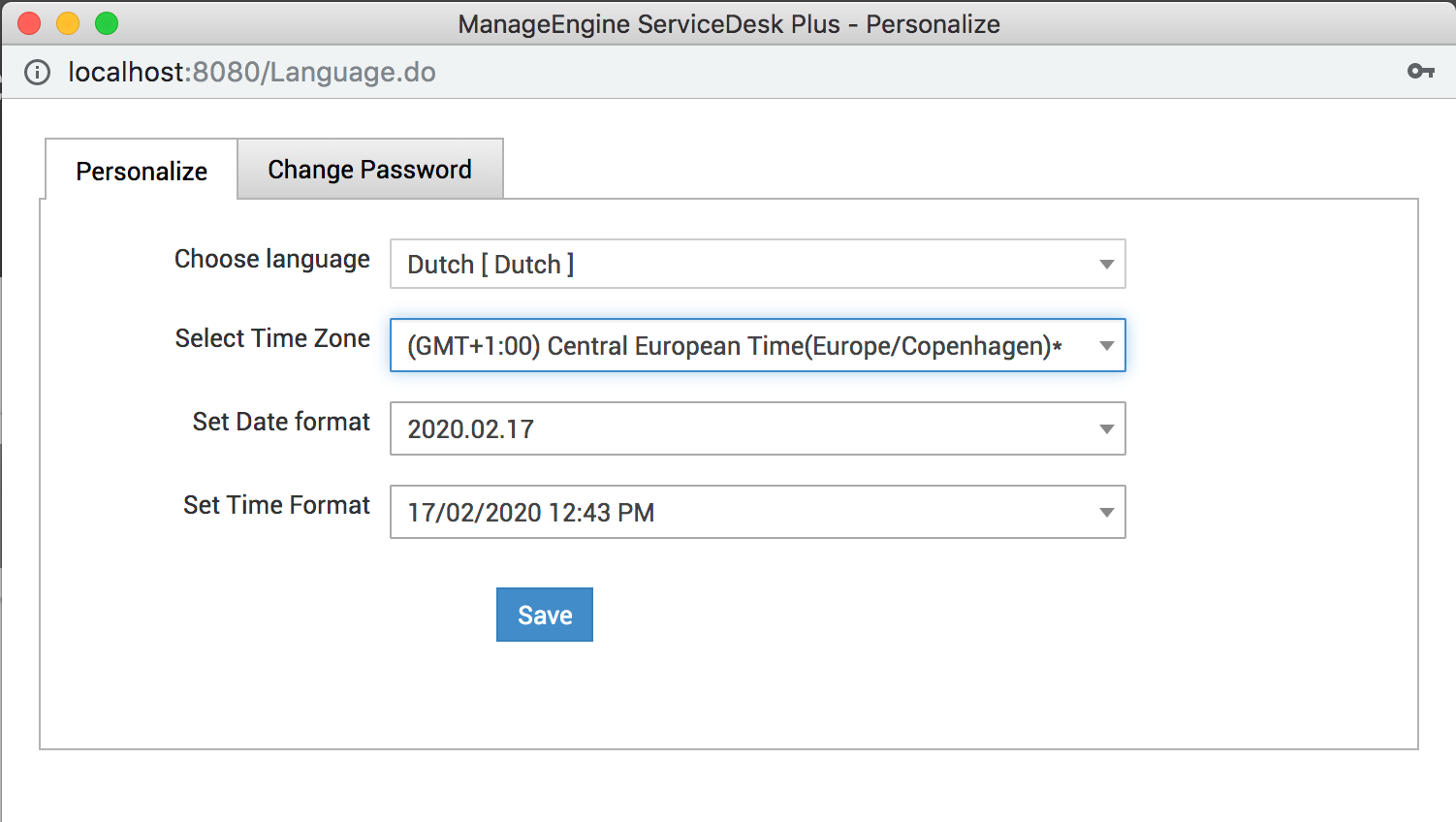 Sie können die Sprache der Anwendung nur ändern, wenn Ihre Organisation über eine Mehrsprachenlizenz für ServiceDesk Plus verfügt.