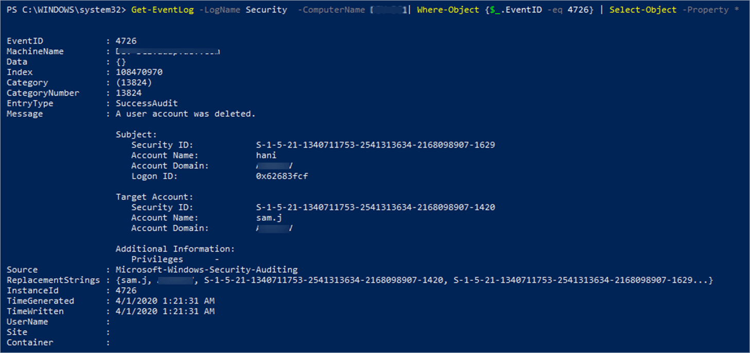 Get-EventLog -LogName Security | Where-Object {$_.EventID -eq 4726} | Select-Object -Property *