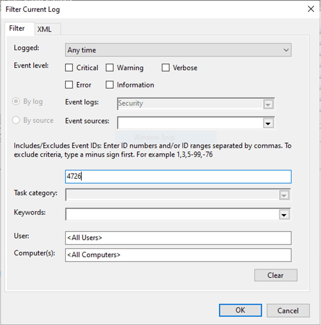 - I den nye dialogboks skal du indtaste 4726 i feltet mærket <Alle hændelses-ID'er>.