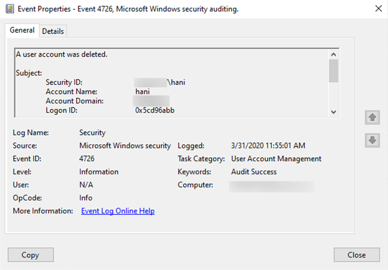 - I vinduet Egenskaber for hændelsen, på fanen Generelt, under Emne > Kontonavn, kan du se den bruger, der udførte denne sletning.