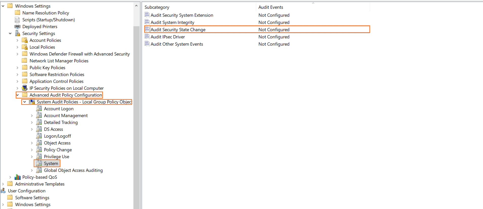 Under System skal du aktivere overvågning for "Overvåg ændringer af sikkerhedstilstand" (slå overvågning til for både vellykkede og mislykkede hændelser).