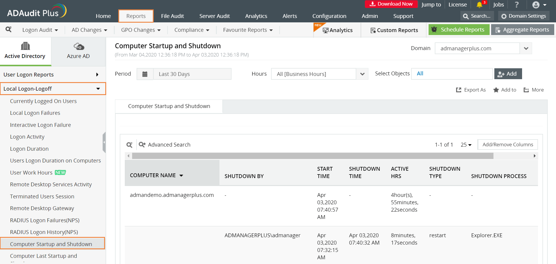 Log ind på ADAudit Plus → Gå til fanen Rapporter → Under Lokal ind- og udlogningsrapporter → naviger til Computeropstart og -nedlukningsrapport.