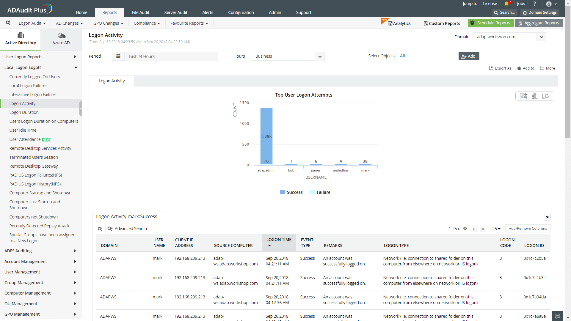 På den anden side vil ADAudit Plus hurtigt scanne alle DC'er i domænet og give dig hele historikken over brugernes login i en intuitiv rapport.