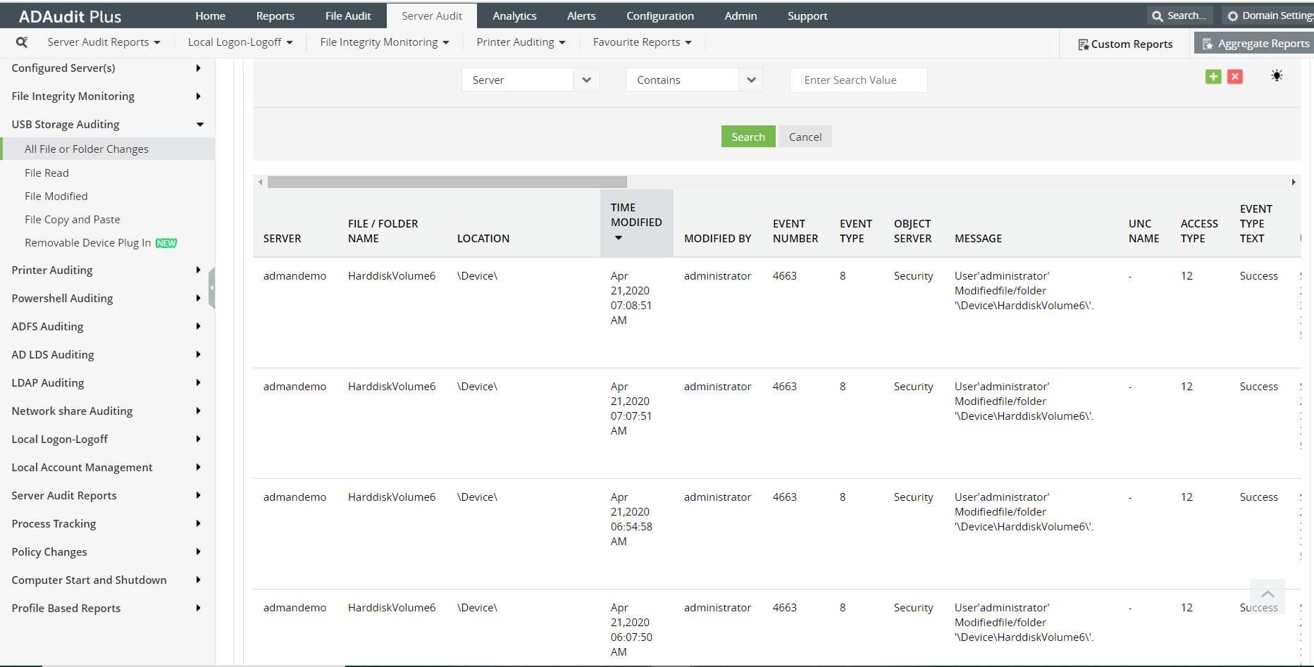 Du kan også udføre en filtreret søgning efter 'server', 'filter-/mappenavn', 'placering', 'ændret af' og 'besked'. Disse filtre hjælper dig med at identificere enhver bestemt hændelse, du leder efter.