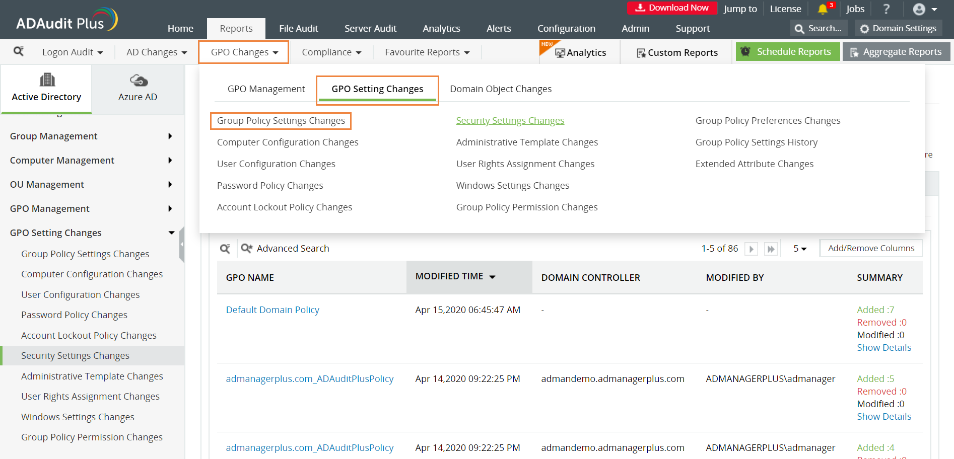 ADAudit Plus scanner automatisk alle domæner for at hente oplysninger om alle gruppepolitikobjekter, genererer rapporten og præsenterer den i et enkelt og intuitiv brugergrænseflade.